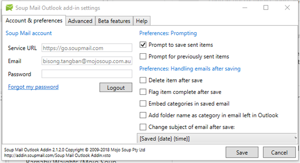 2. From the "Soup Mail Outlook add-in settings", select "Account & preferences" (if not already selected) and to the right of the form, make a selection(s) based on your preferred preference(s)