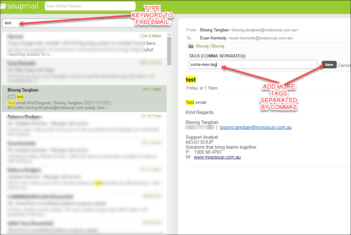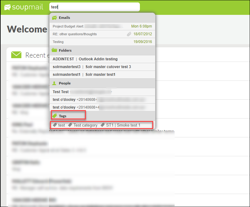 - Global search - search for required tag from the Soup Mail dashboard in the New Global Search bar as shown below. In this example, the keyword "test" returns tag(s) with "test" in them.