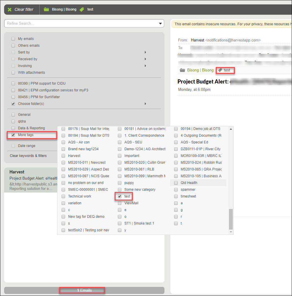 On checking the test tag, the list of emails is filtered to just one email as shown below: