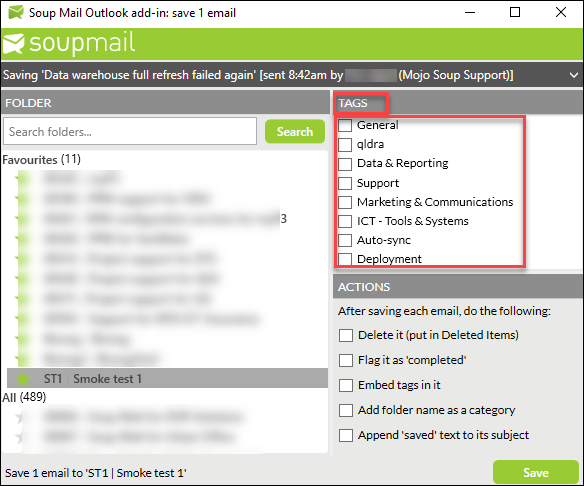 Automatically when saving emails: Tags are automatically added to your Soup Mail team when an email is saved that contains a tag (or Category, as they're called in Outlook; or Label, as Gmail calls them). If you're using the Soup Mail Outlook Add-in, you can set tags in the save dialog. Soup Mail will also add any tags that are embedded within saved emails (that's Categories in Outlook/Labels in Gmail).