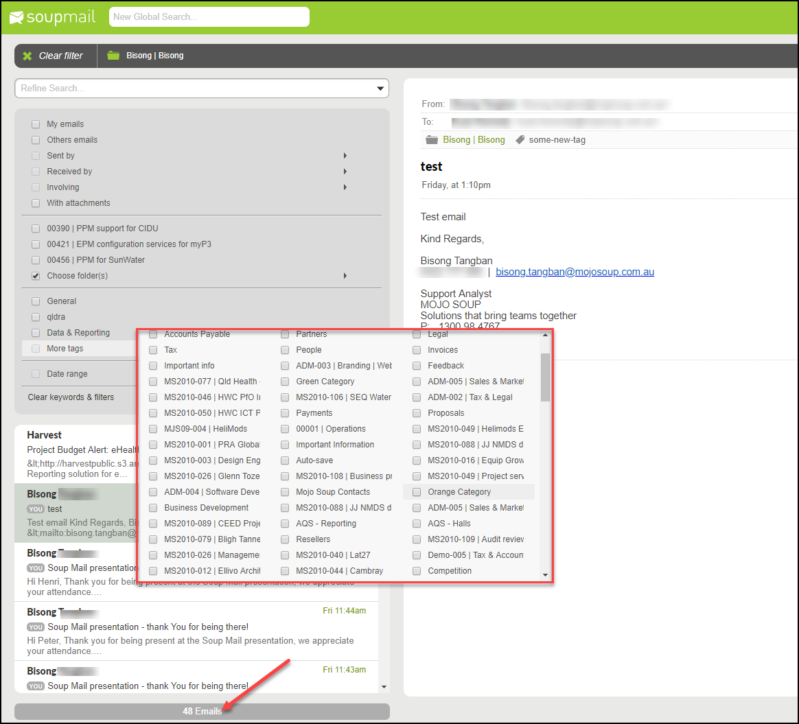 The figure above shows a list of 48 Emails before any tag is selected.