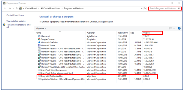 - Here, scroll to "Soup Mail Outlook Addin" and review the version details in the Version column. You can also find the "Soup Mail Outlook Addin" by searching for it using the "search Programs & Features" feature;
