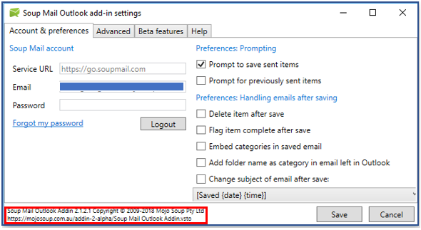 Current Soup Mail Outlook add-in version - 2.1.2.0