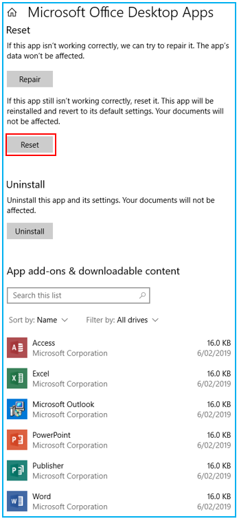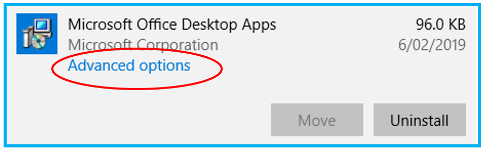 2. Locate the Microsoft Office Desktop Apps and select the "Advanced Options" as shown below. This will display a list of all Microsoft Office Apps.
